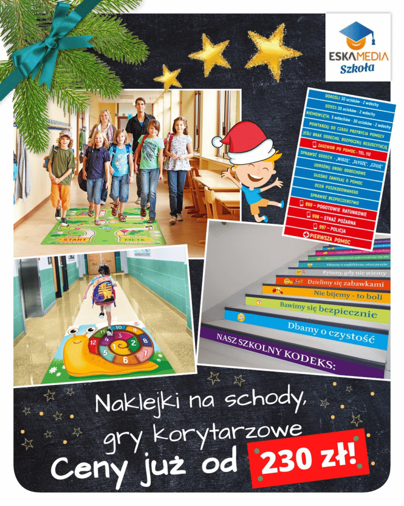 Obecnie dostępna jest wyjątkowa promocja, dzięki której oferta staje się jeszcze bardziej atrakcyjna. Kupując min. dwie gry na podłogę do szkoły – naklejki na schody do szkoły są dodawane gratis!* Takie połączenie pozwala na kompleksowe wzbogacenie szkolnej przestrzeni zarówno na korytarzach, jak i w kluczowych punktach komunikacyjnych.